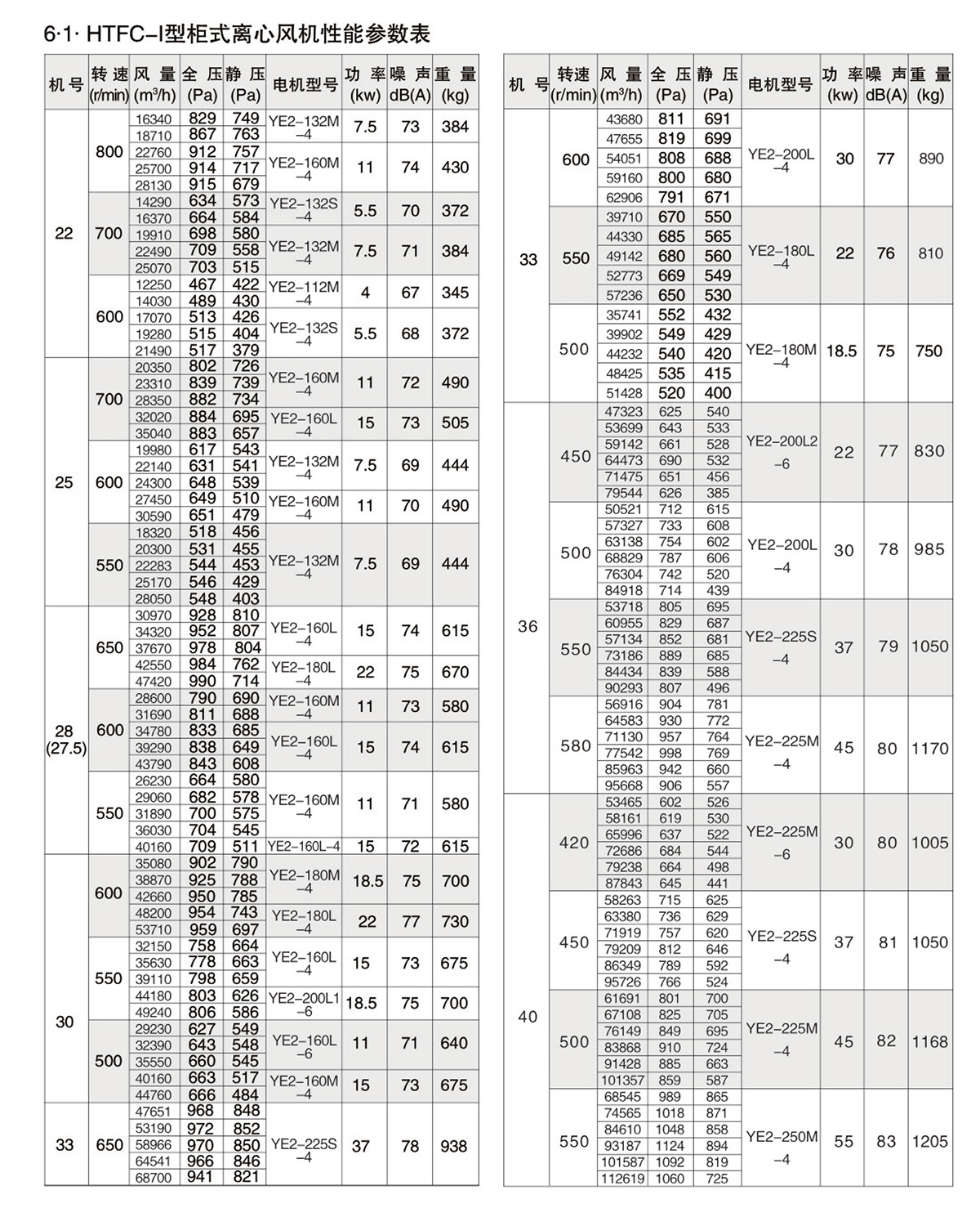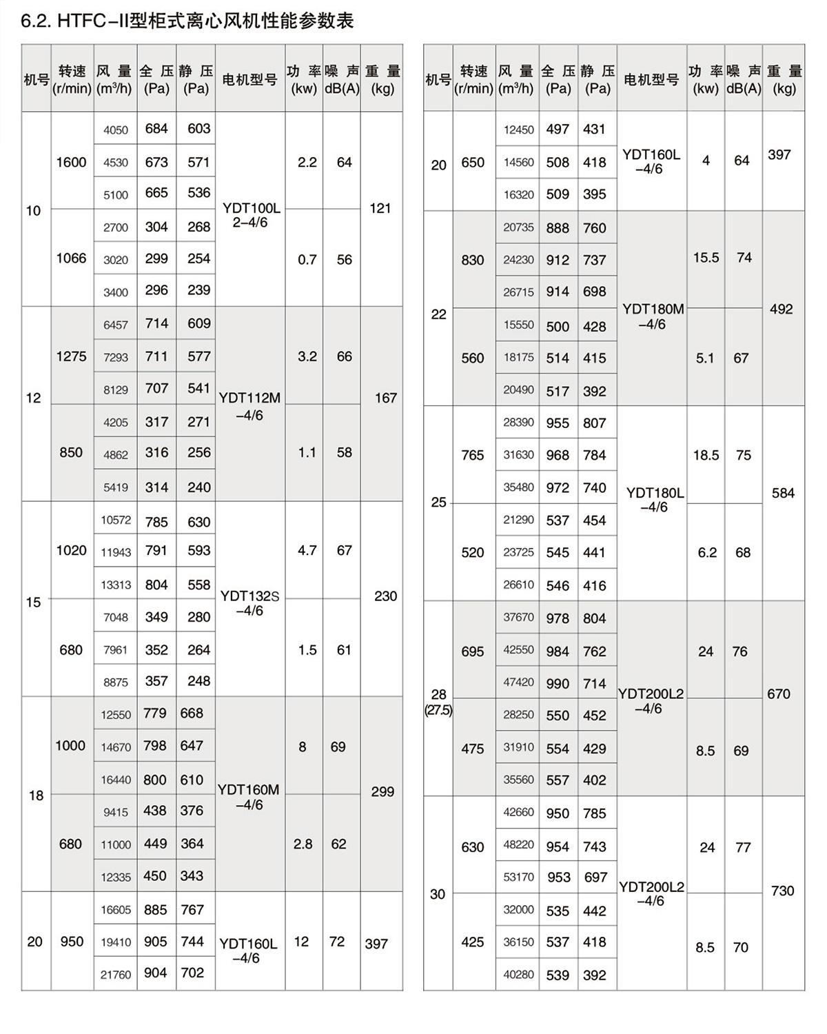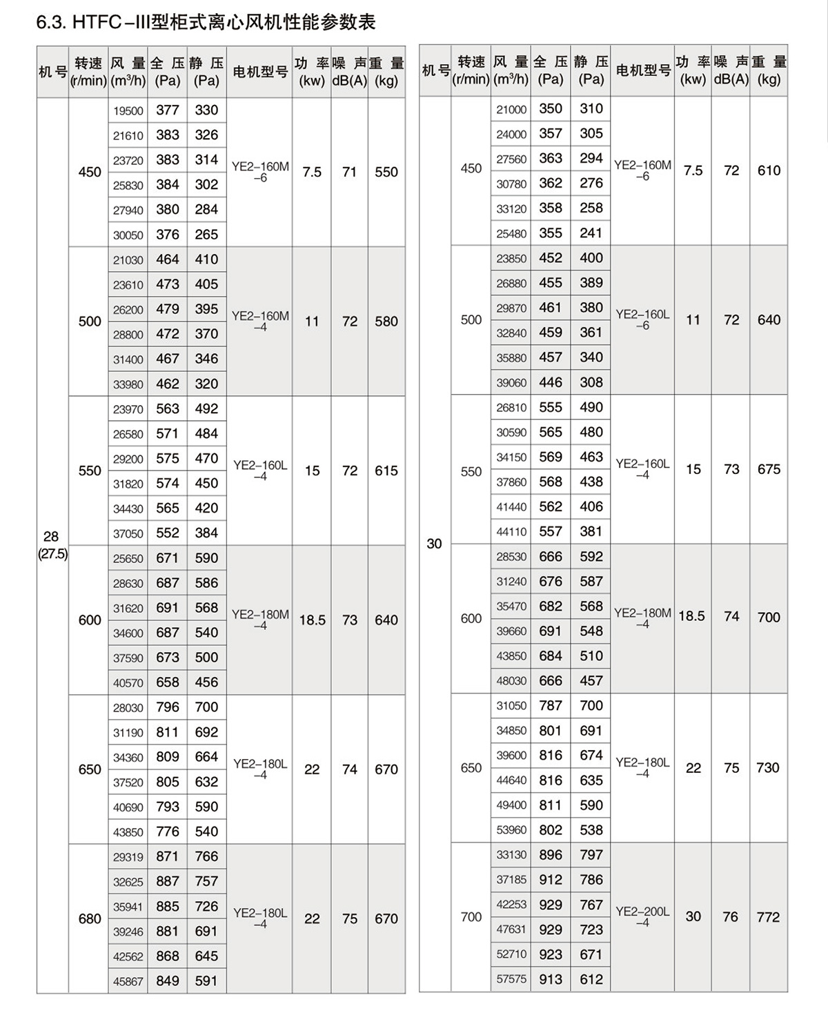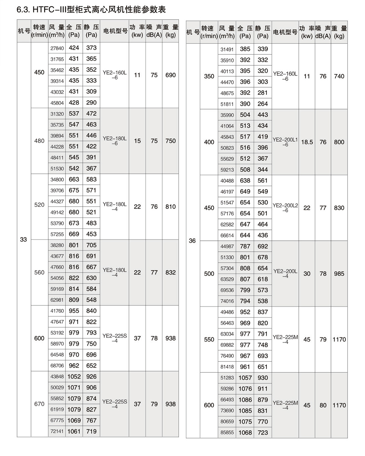 1.2.风机按机号分为9-40十三种规格系列风量范围从1650~112600m³/h,全压范围从180~1200Pa。HTFC型柜式离心风机经不断的改进和开发,现可分为Ⅰ、Ⅱ、Ⅲ、Ⅳ
