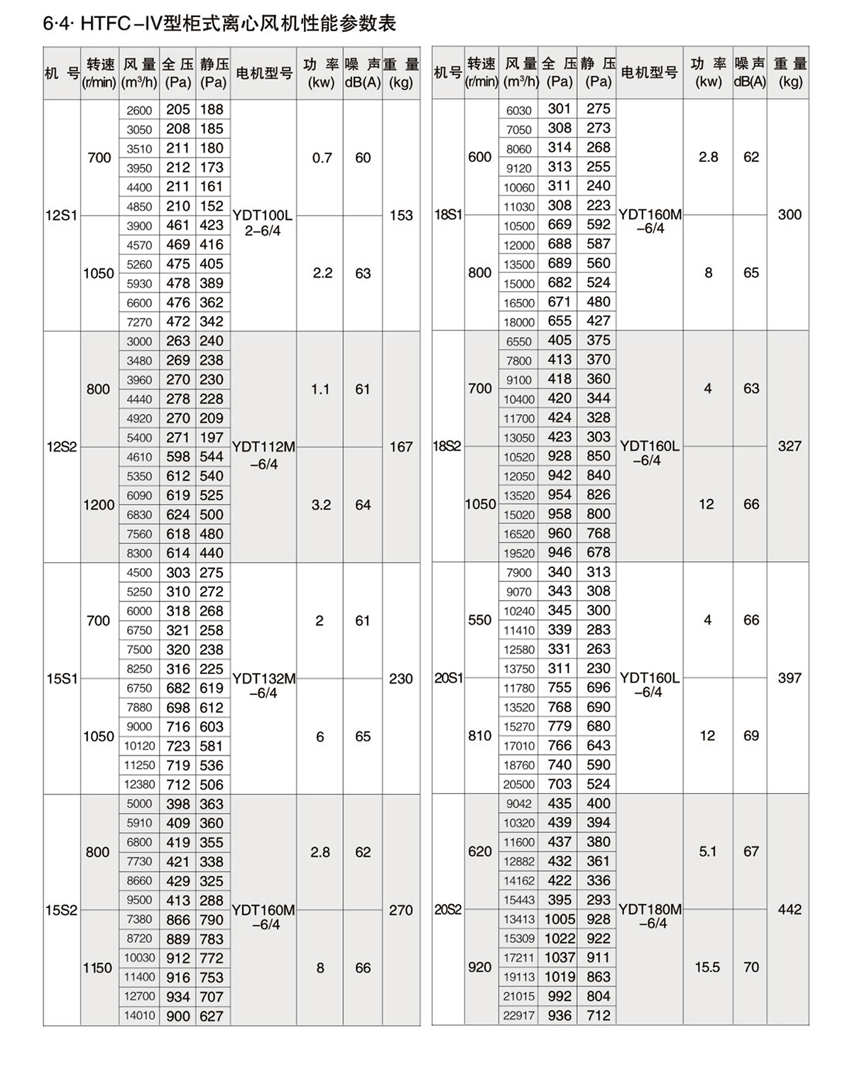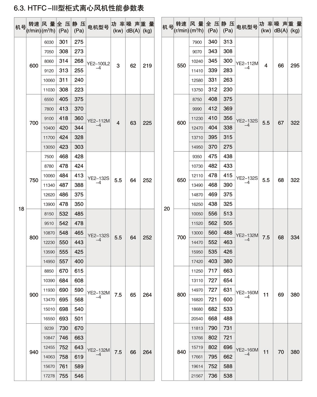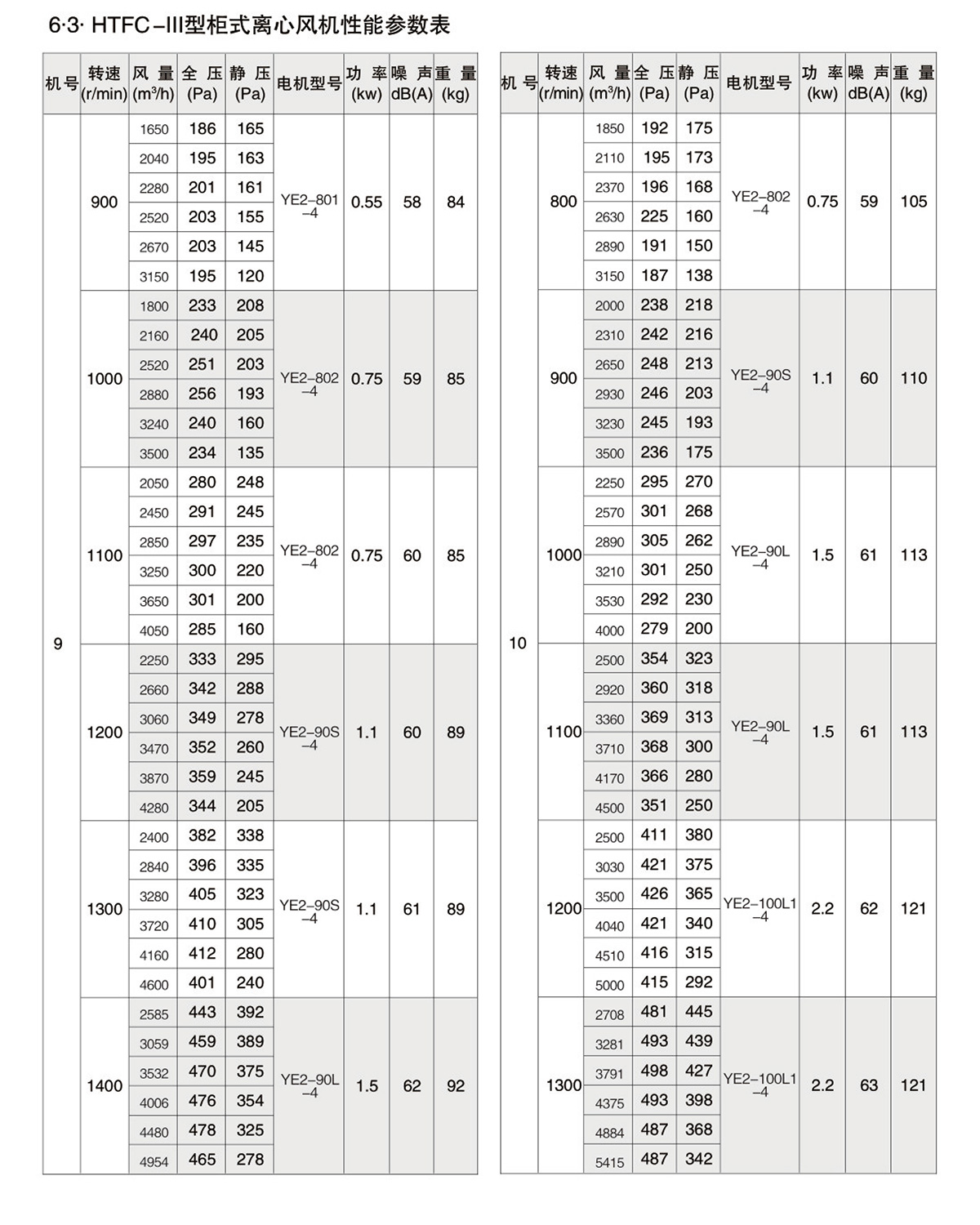 1.2.风机按机号分为9-40十三种规格系列风量范围从1650~112600m³/h,全压范围从180~1200Pa。HTFC型柜式离心风机经不断的改进和开发,现可分为Ⅰ、Ⅱ、Ⅲ、Ⅳ