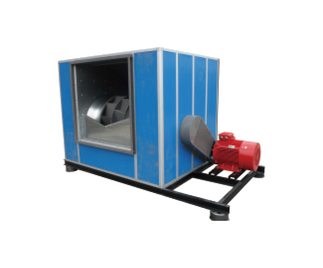 1.1.HTFC型柜式离心风机是一种高效率、低噪声箱式离心风机。产品由低噪声前倾多翼离心风机、电机、轴承、传动件、消声型箱体等组成。根据安装位置的不同,提供12种不同角度的进出风口位置,以满足用户不同的安装环境需要。根据消防与通风的要求不同分A型和B型两种类型,A型电机装在箱体外,用于消防排烟,并经国家消防装备监督质量检验中心按GA211-1999《消防排烟风机耐高温试验方法》进行耐高温试验,能在300℃高温条件下连续运行60分钟以上;B型电机装在箱体内,用于通风换气。