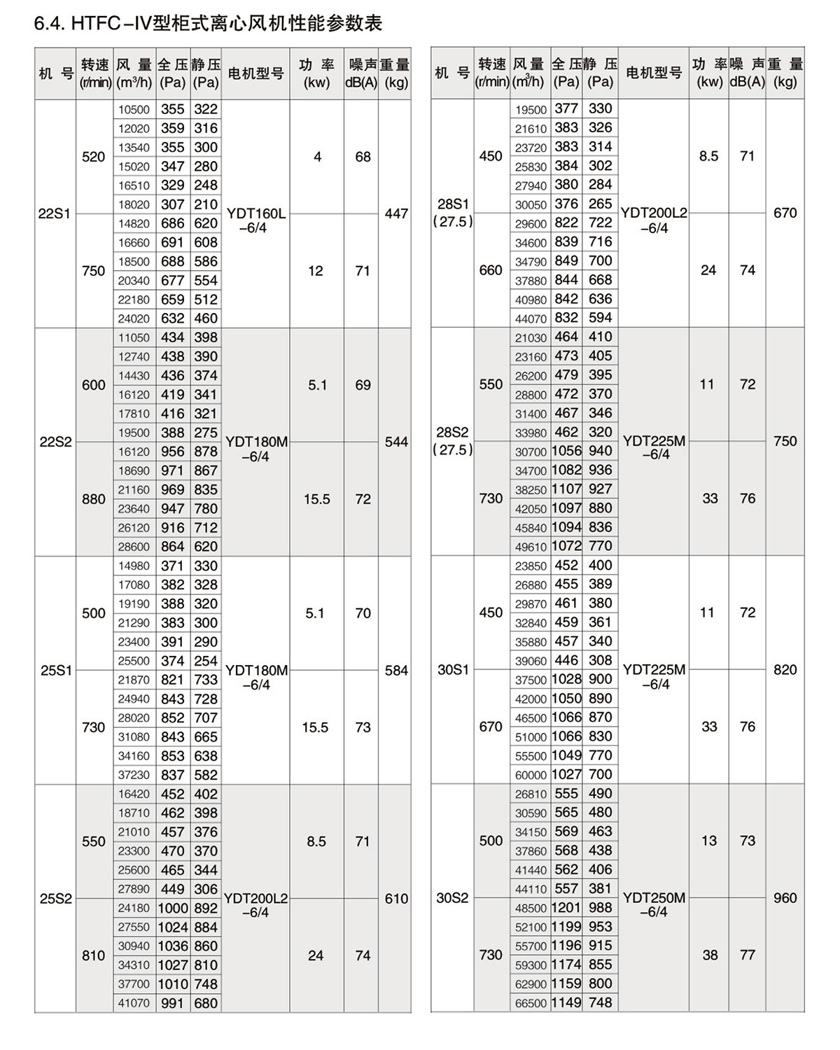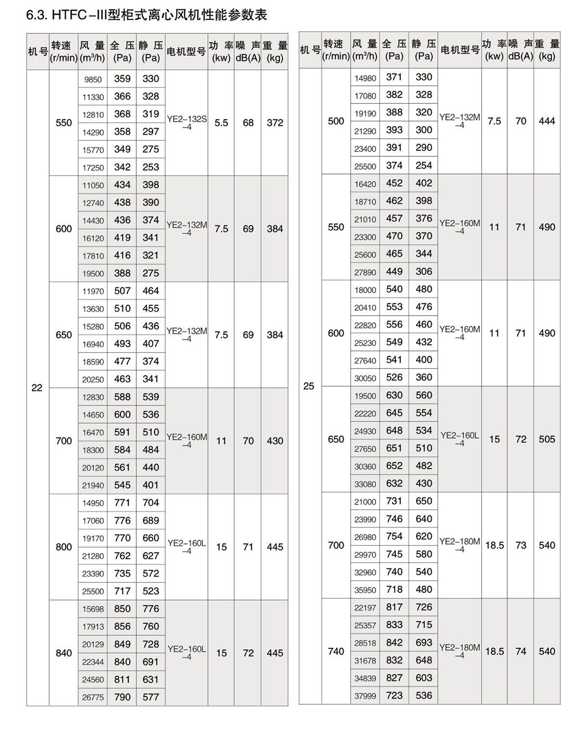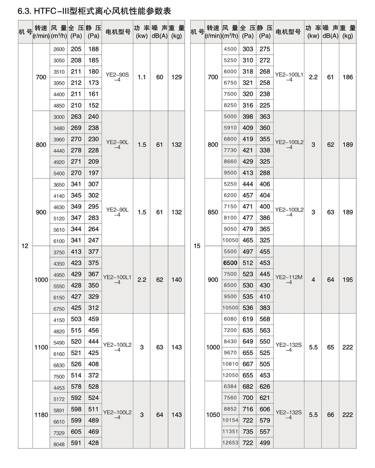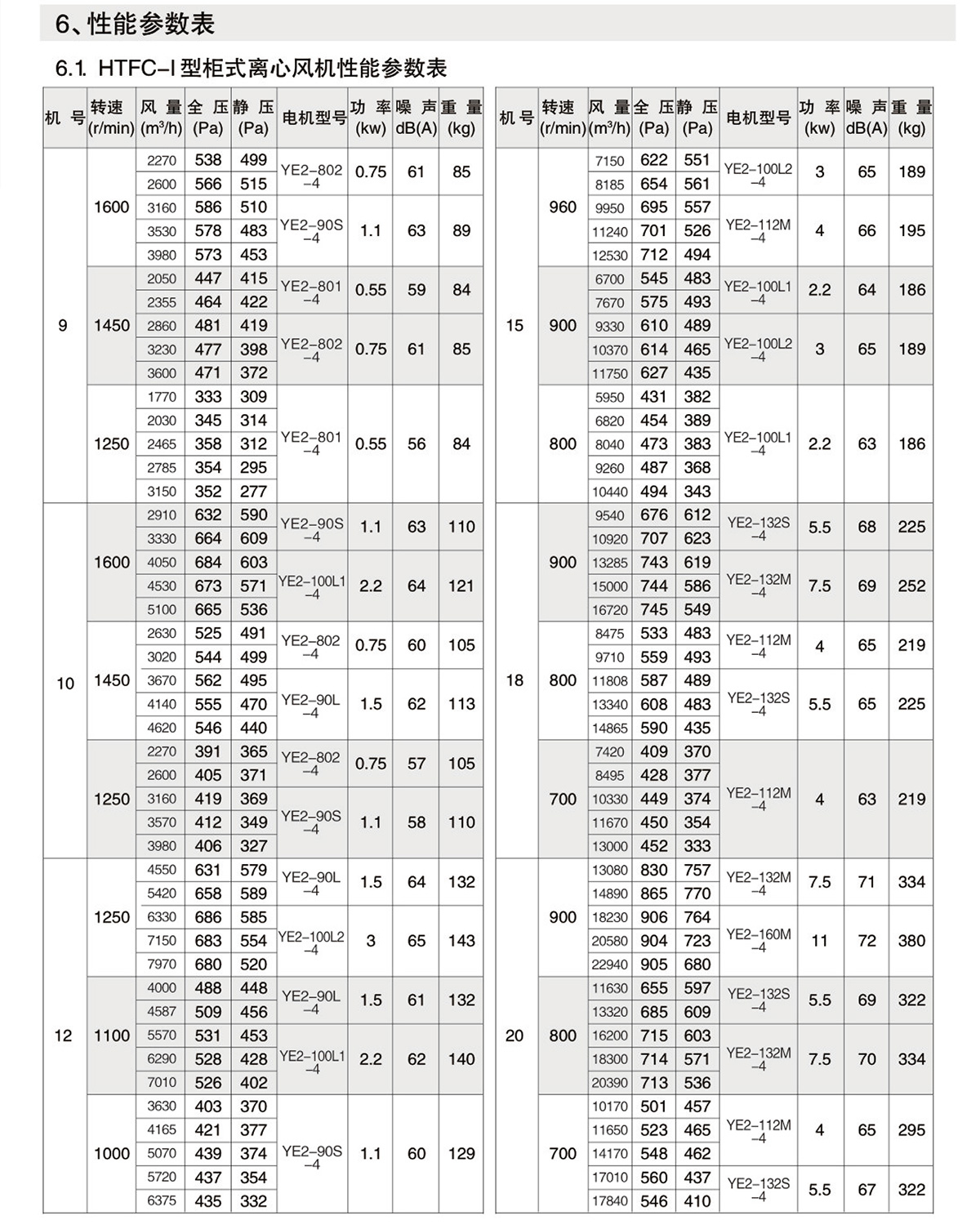 1.2.风机按机号分为9-40十三种规格系列风量范围从1650~112600m³/h,全压范围从180~1200Pa。HTFC型柜式离心风机经不断的改进和开发,现可分为Ⅰ、Ⅱ、Ⅲ、Ⅳ