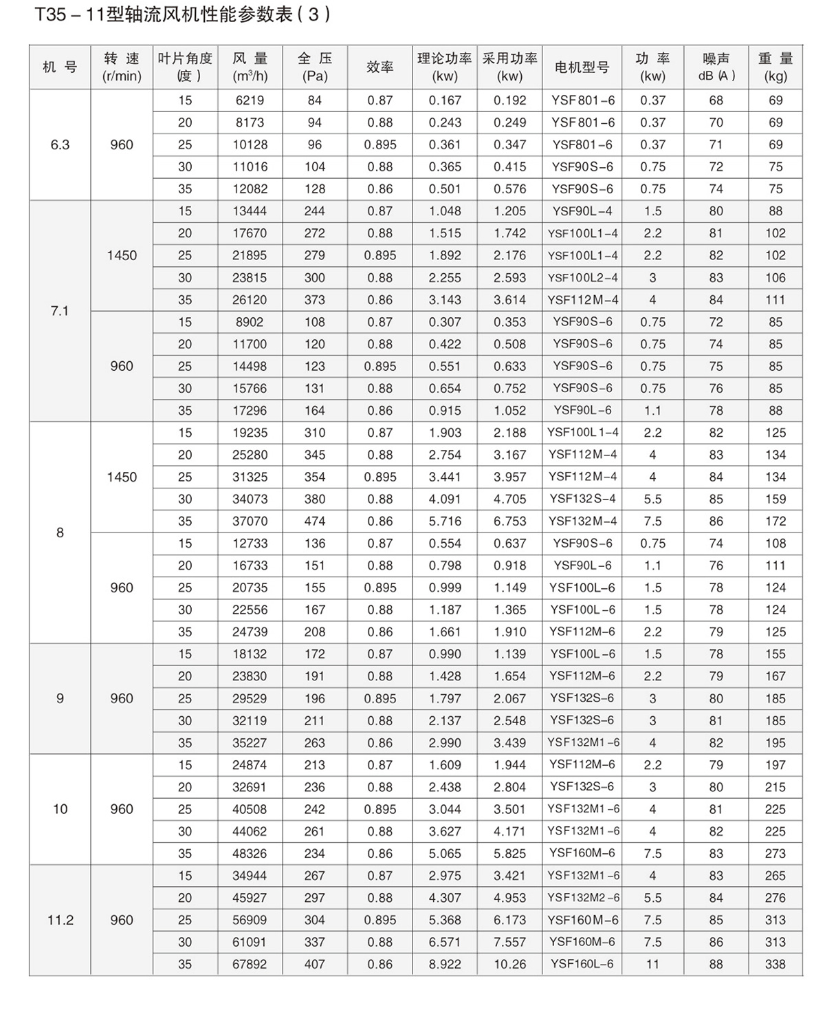 1.1.T35-11型轴流式风机主要用于一般工厂、仓库住宅内通风换气或加强暖气散热用。风机按机号分为2.8#-11#共三十个规格,每一规格风机叶片数都为4片,叶片角度有15°、20°、25°、30°、3五种,参数范围广,风量范围从800-67000m³/h,风压范围从40-470Pa。风机可壁式安装也可管道式安装。
