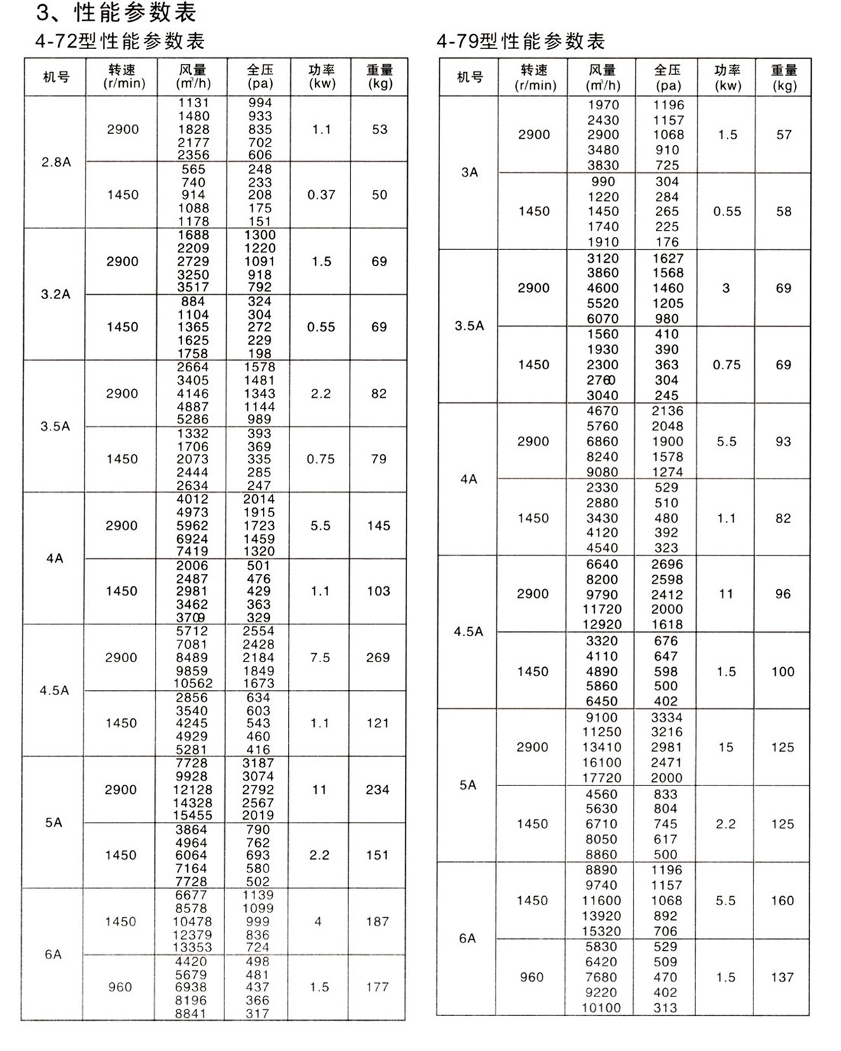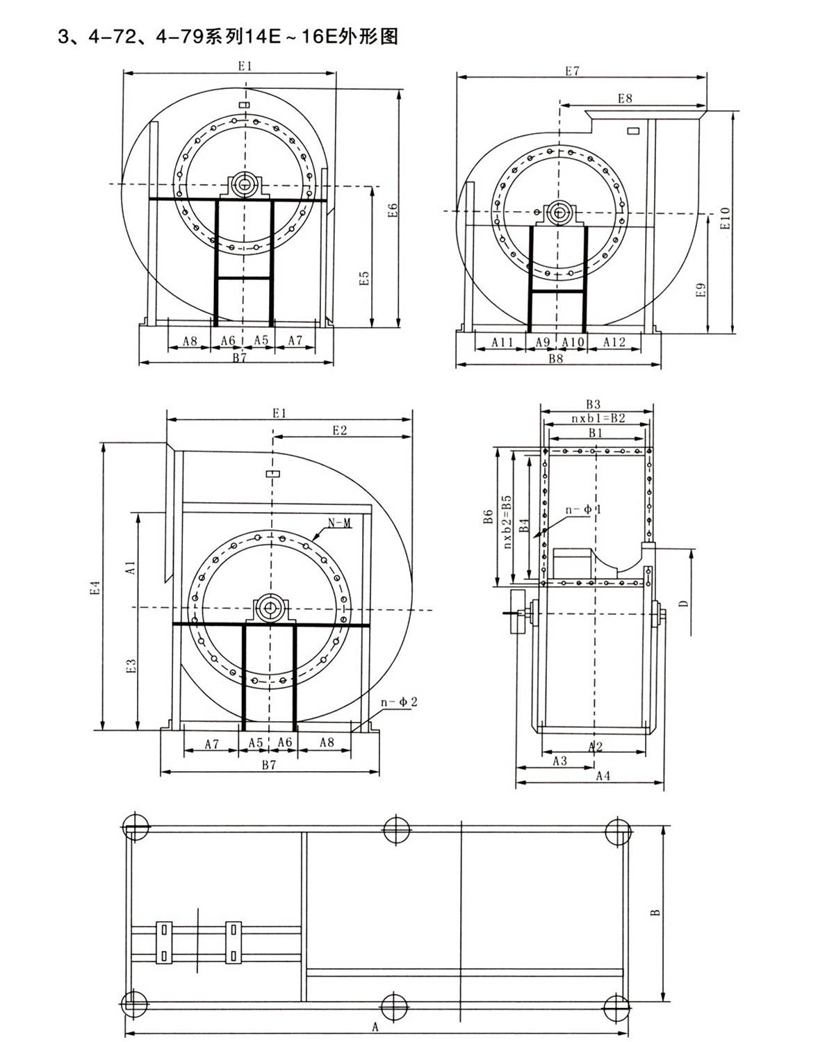 3、结构:机号6#以下的4-72型风机主要有叶轮、机壳、进风口等部分配直联电动机组成,7#以上除具有上述部分外还有传动部分。