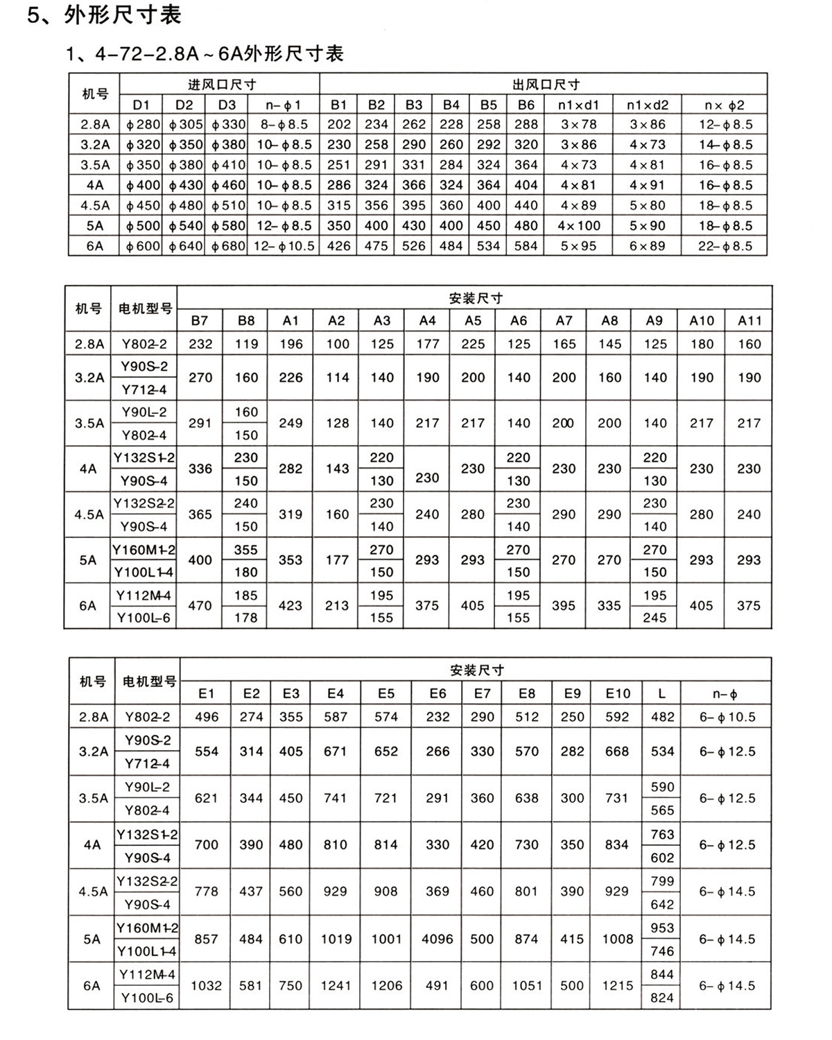 2、型式:4-72型离心通风机可制成右旋和左旋两种型式,风机的传动方式为A、B、C、D四种,6#以下采用A式,7~12#采用C、D式,16#以上采用B式。